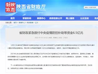 近日,陕西省财政厅紧急拨付疫情防控资金6.5亿元。其中将中央财政部下达陕西省新冠肺炎疫情防控补助资金5亿元全部拨付西安市,集中力量支持西安疫情防控。同时,再次动用省级预备费1.5亿元,支持陕西省防疫办、咸阳市、延安市开展疫情防控工作。