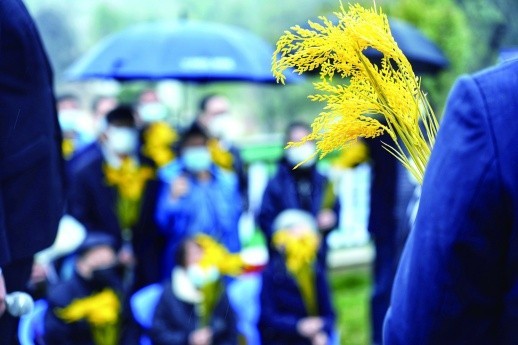 4月1日,长沙唐人万寿园,袁隆平院士的亲友手持金黄色稻穗前来祭扫。