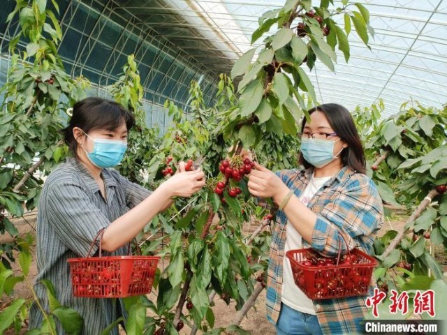 游客们正在温宿县柯柯牙镇帕克勒克村大棚内采摘车厘子。冯磊 摄