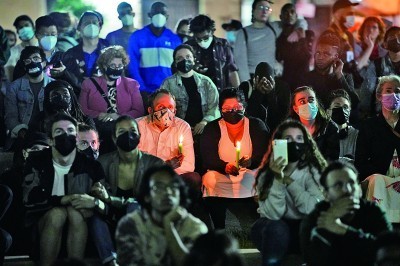 2021年5月25日,人们在美国纽约参加悼念弗洛伊德的守夜活动。当日是非洲裔美国人乔治·弗洛伊德遭明尼苏达州白人警察“跪颈”执法致死一周年,美国多地举行悼念活动。新华社发
