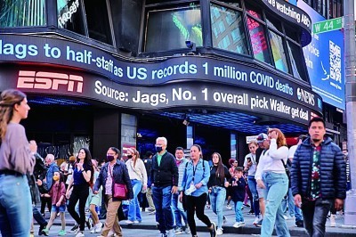 5月12日,在美国纽约时报广场,电子屏上播放关于新冠逝者的新闻。美国总统拜登当日在白宫网站发表声明说:“今天,我们纪念一个悲剧性里程碑:100万美国人死于新冠。”新华社发