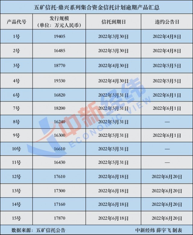 该事件将五矿信托发行的多款产品的逾期问题公之于众。中新经纬从多位投资者处了解到,由五矿信托于2021年发行的鼎兴系列集合资金信托计划,至少已经有14只产品出现逾期,总金额超过24亿元人民币。购买前几期产品的一些投资人,目前仅收到20%左右的本金。由于债务人提出的展期兑付时间长达18个月,多位投资人对未来兑付情况表达了担忧。