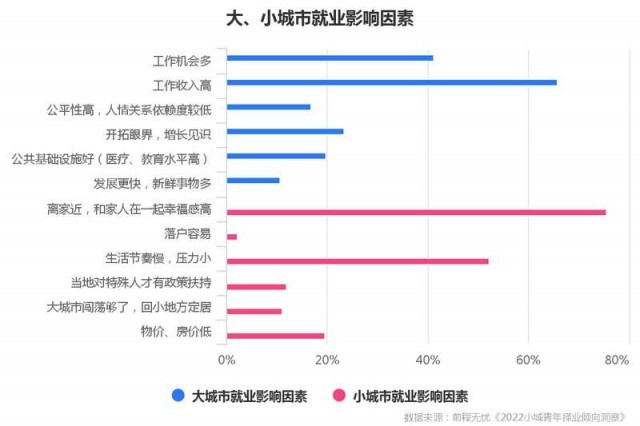 小城市和大城市各有不同优势,报告提出,从选择比例最高的两项对比来看,选择小城市的人更偏向精神层次的满足,选择大城市的人则更追求外部客观条件的匹配。