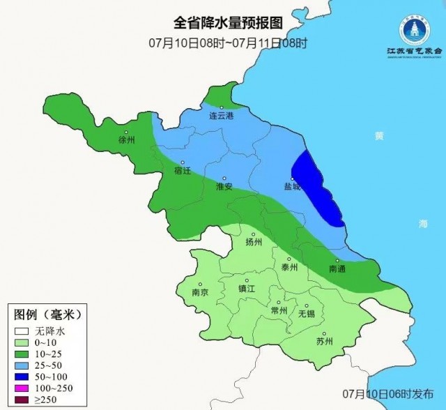 据江苏省气象台消息,7月10日至11日沿江及以北地区有较强降水,沿江和苏南地区伴有高温天气。今天(10日)江淮之间东部和淮北东部地区多云转阴有阵雨或雷雨,雨量中到大,局部暴雨,其他地区多云有分散性阵雨或雷雨,局部雨量大。
