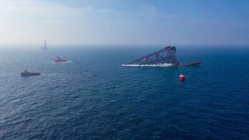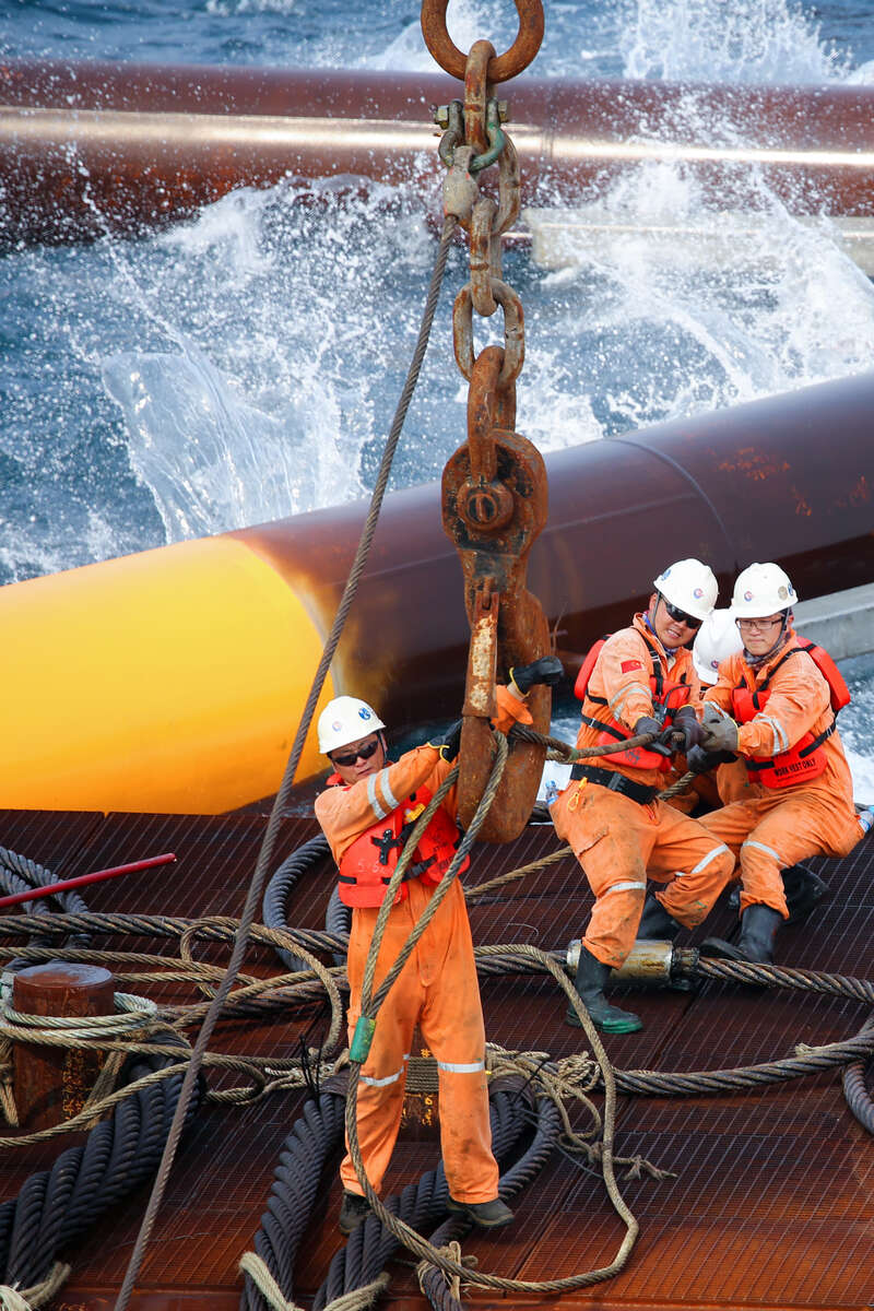 导管架滑移下水后,水手配置扶正吊装锁具,为导管架扶正做准备工作。李浩玮/摄