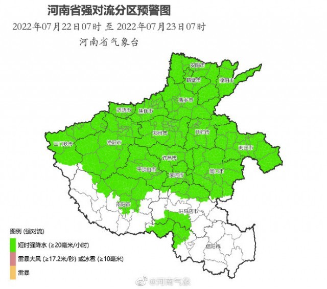 河南省气象台2022年7月22日7时00分发布强对流蓝色预警:预计7月22日7时00分至23日7时00分,安阳、鹤壁、濮阳、新乡、洛阳东部和南部、平顶山、南阳北部、郑州东部和南部、许昌、漯河、开封、商丘、周口、驻马店北部等地的部分县市(区)将出现8级以上雷暴大风或直径10毫米以上冰雹,局地风力可达11级以上;淮河以北部分县市(区)将有短时强降水天气,小时雨量30~60毫米,请密切关注属地气象部门发布的最新预报信息和气象灾害预警信号,做好防范应对工作。上述地区的相邻县市(区)也需关注。
