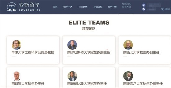 这一切是真的吗?在索斯教育官网上,记者看到其精英团队招揽了不少“名校前招生官”。然而,比照这些“前招生官”照片,记者发现“前美国西北大学招生办副主任”是一位专门研究肿瘤学的英国医生,“前耶鲁大学招生办主任”实是耶鲁大学管理学院的一名教授。为此,记者专门邮件联系了耶鲁大学的这名教授,该教授表示:“I have never held that position, I have never been involved in Yale University admissions, and this organization has absolutely nothing to do with me.(我从来没有担任过那个职位,从来没有参与过耶鲁大学的招生工作,这个组织和我没有任何关系。)”