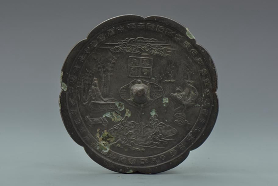 形为八出葵花的唐真子飞霜铜镜,上饰有祥云托月纹,下饰有山石池水,池中一荷叶垂直耸立,上伏一龟,恰成镜钮与钮座。左侧竹林下一人峨冠博带,端坐抚琴,另侧树下凤鸟足踏祥云,回首起舞。赵好说:“这蕴含着‘同心人,心相亲,照心照胆保千春’的美好愿景。”