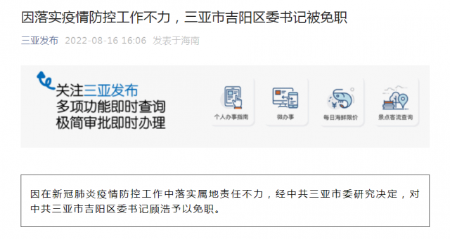 据“三亚发布”微信公众号8月16日消息,因在新冠肺炎疫情防控工作中落实属地责任不力,经中共三亚市委研究决定,对中共三亚市吉阳区委书记顾浩予以免职。