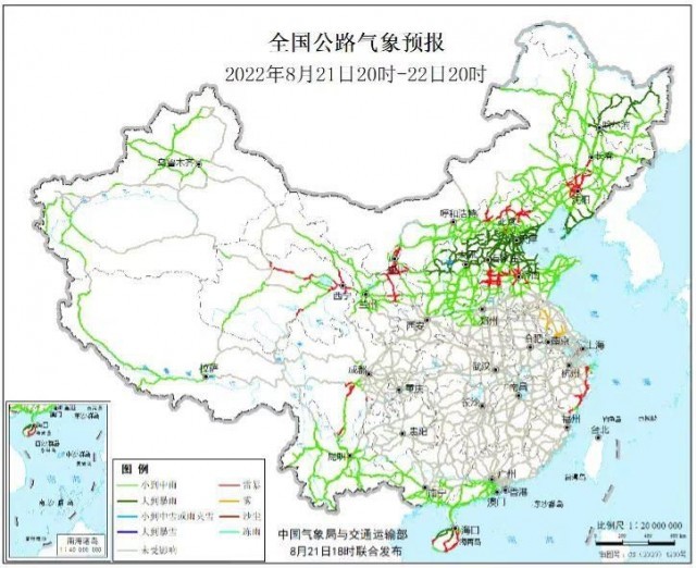 8月21日20时至22日20时,陕西北部、山西中北部、河北中部、北京南部、天津、山东西北部及黑龙江中部和东北部、云南西南部、海南岛西北部等地的部分地区有大到暴雨,其中,陕西东北部、山西北部、河北中部等地局地有大暴雨。河北北部和南部、辽宁西北部、吉林中部、山东西北部、浙江沿海、福建东北部、海南岛大部、四川中南部、宁夏大部、青海中东部等地局地有雷暴。另外,江苏中北部、云南中部等地局地有雾。