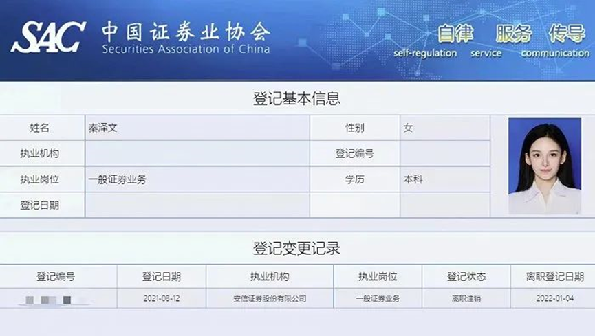 有记者从中国证券业协会公开信息中得知,秦泽文的学历为本科,执业岗位是“一般证券业务”,并未取得分析师资质。安信证券在8月25日发布声明称,秦泽文在公司的从业时间仅一年半,目前已离职八个月并注销证券行业从业资格,参加社会活动属个人行为,与公司无任何关系,更不能代表行业女性。有关秦泽文的学历和从业资质问题,的确显得疑云重重。