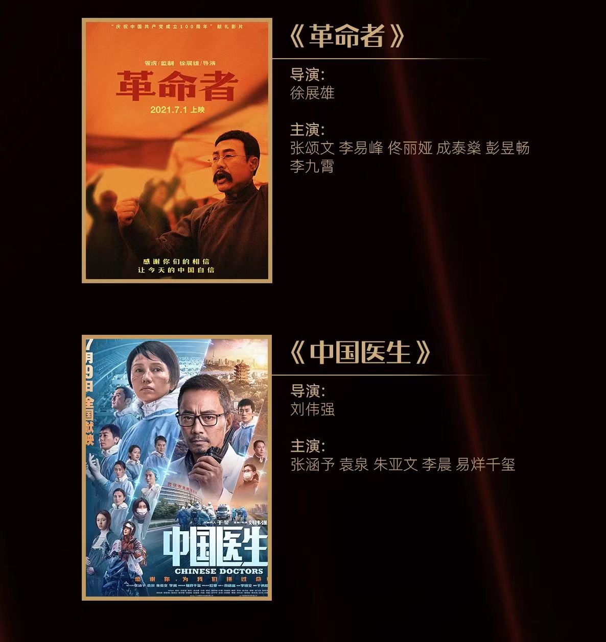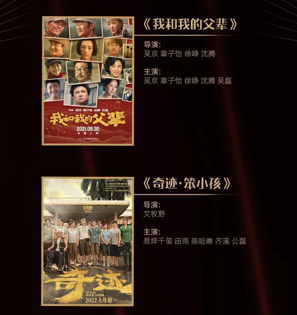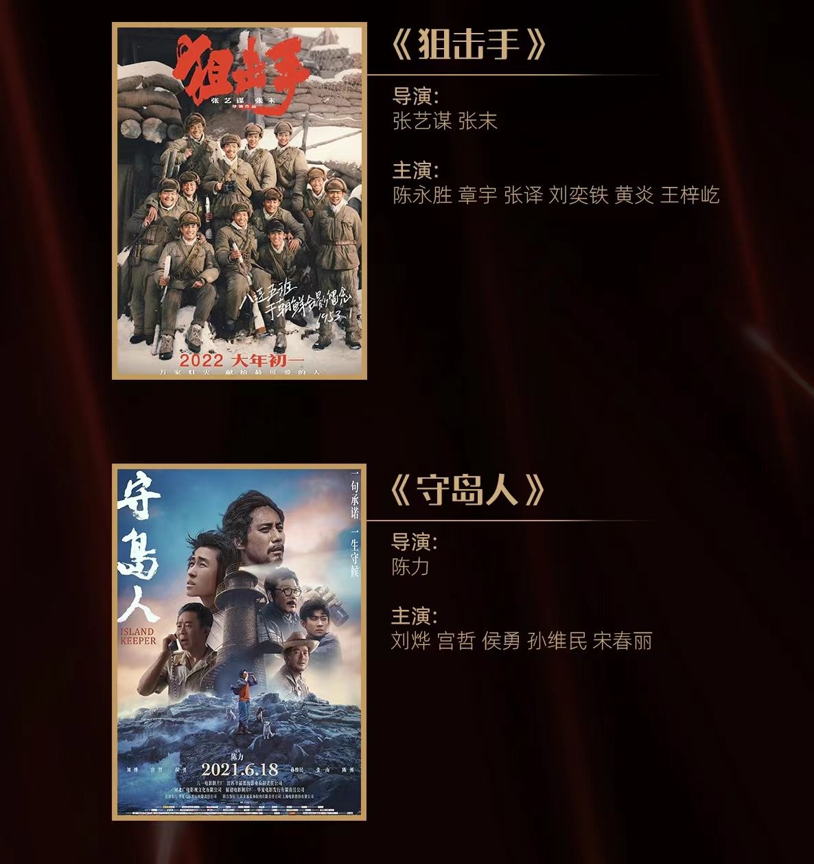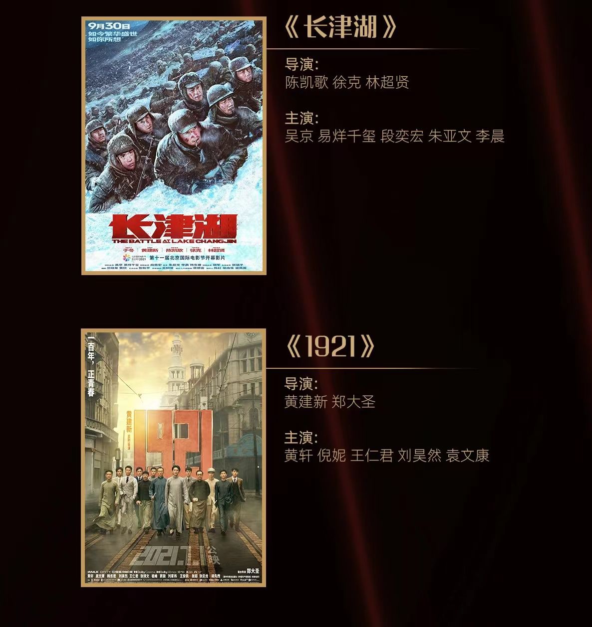 自去年起,组委会将传媒关注的焦点从未上映新片逐步转变成已上映“头部影片”的群雄逐鹿。本届入围片单中,已取得不俗票房和口碑的主流电影《长津湖》《我和我的父辈》《1921》《革命者》《中国医生》《狙击手》《守岛人》占据半壁江山。