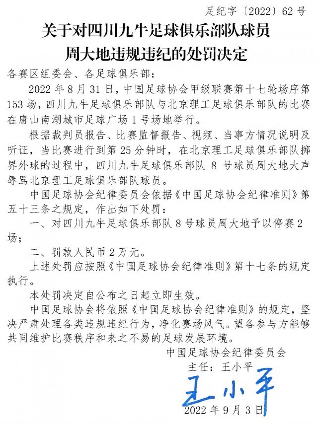 中新网9月4日电 据中国足球协会官方网站消息,2022年8月31日,中国足球协会甲级联赛第十七轮场序第153场,四川九牛足球俱乐部队与北京理工足球俱乐部队的比赛中,四川九牛足球俱乐部队8号球员周大地大声辱骂北京理工足球俱乐部队球员,被罚停赛2场,罚款人民币2万元。