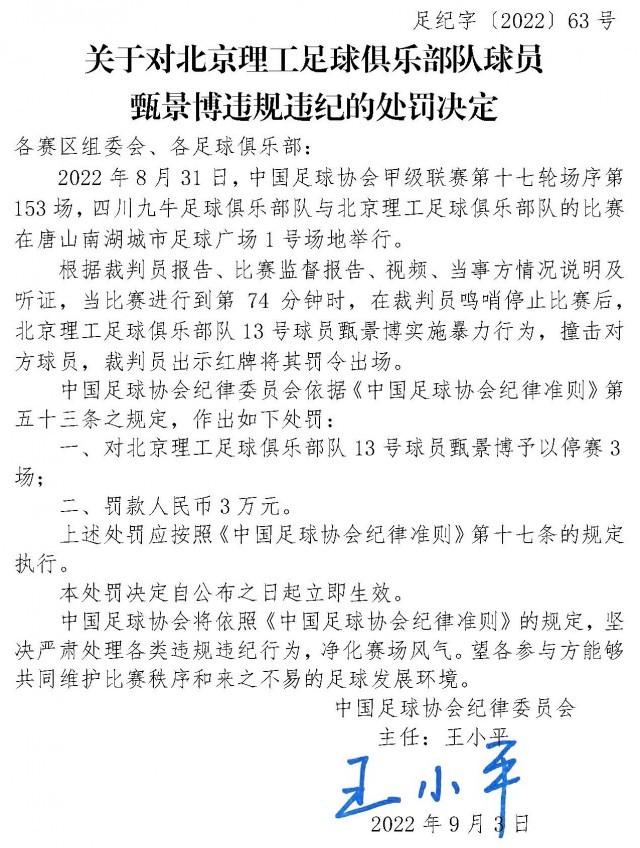 在裁判员鸣哨停止比赛后,北京理工足球俱乐部队13号球员甄景博实施暴力行为,撞击对方球员,裁判员出示红牌将其罚令出场。甄景博被罚停赛3场,罚款人民币3万元。