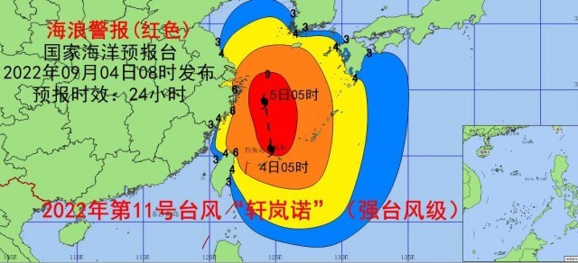受 “轩岚诺”的影响,预计9月4日中午至5日中午,东海、台湾以东洋面、钓鱼岛附近海域将出现8到12米的狂浪到狂涛区,近海海域海浪预警级别为橙色;上海、浙江近岸海域将出现4到6.5米的巨浪到狂浪,该近岸海域海浪预警级别为红色,江苏南部、福建北部近岸海域将出现2.5到4米的大浪到巨浪,该近岸海域海浪预警级别为黄色,山东半岛东部近岸海域将出现1.5到2.5米的中浪到大浪,该近岸海域海浪预警级别为蓝色。