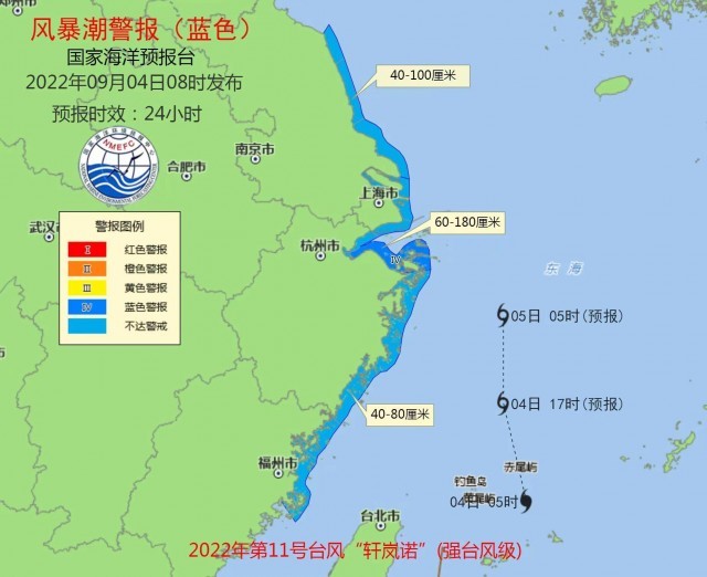 风暴潮方面,预计9月4日上午到5日上午,江苏盐城和南通沿海将出现40到100厘米的风暴增水,长江口至杭州湾沿海将出现60到180厘米的风暴增水,浙江台州到福建福州沿海将出现40到80厘米的风暴增水。浙江省宁波市和舟山市的风暴潮预警级别为蓝色。