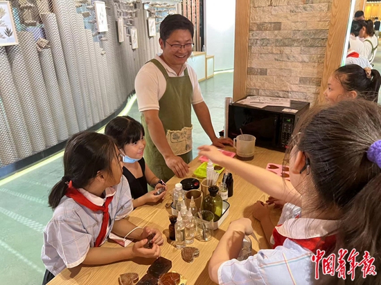 小学生体验制作艾草香皂。