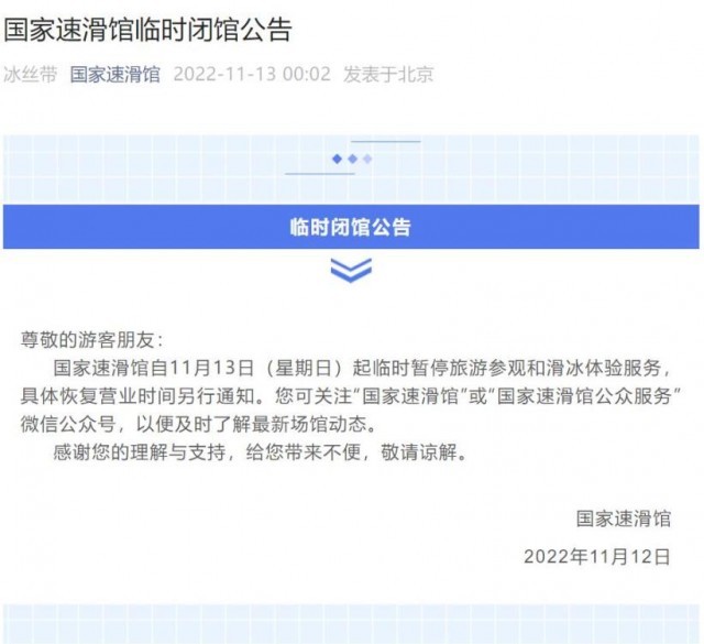 中新网11月13日电 据国家速滑馆微信公众号13日消息,国家速滑馆自11月13日(星期日)起临时暂停旅游参观和滑冰体验服务,具体恢复营业时间另行通知。(中新财经)