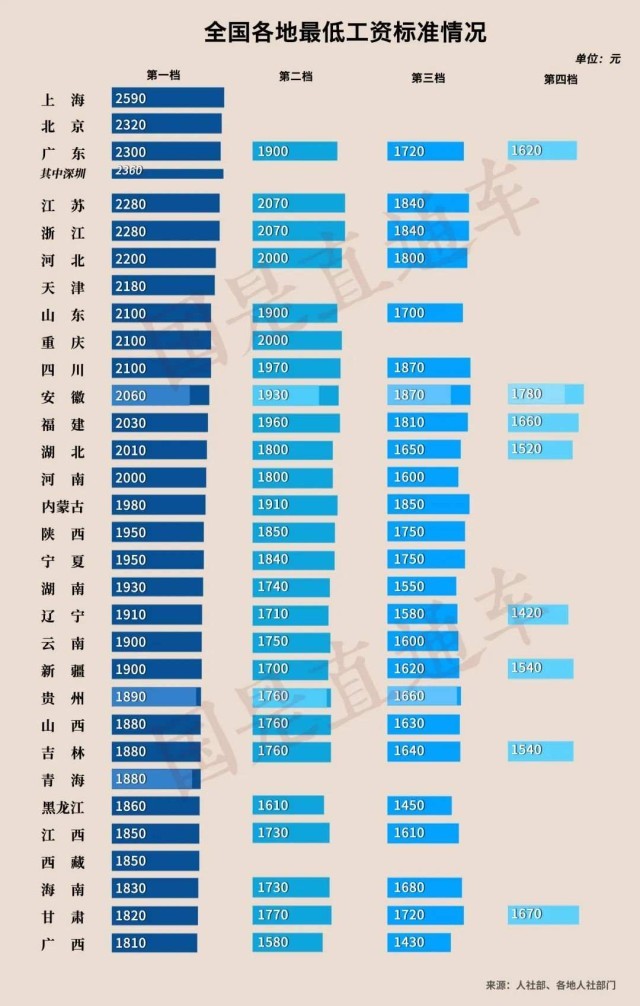 上述四地调整后,全国已有15个省份最低工资标准加入“2000元俱乐部”。其中上海最高,为2590元。紧随其后的是:北京(2320元)、广东(2300元,其中深圳2360元)。