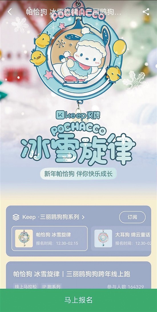打开Keep,点击顶部的“活动”按钮,就进入了奖牌比赛页面。记者随机选择了一款名为“帕恰狗”跨年线上跑的热门赛事,显示目前已有超16万人参加,报名时间是去年的12月30日至今年的2月15日,点击进入后,大幅帕恰狗奖牌图片几乎占去了屏幕的三分之二,底部绿色的“马上报名”按钮显得格外醒目。