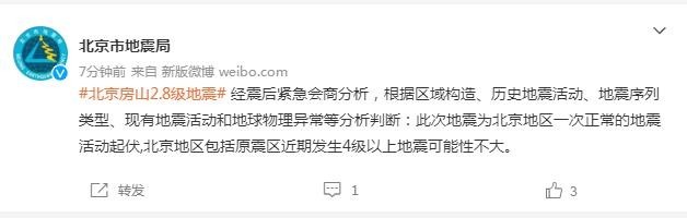 中新网2月12日电 据北京市地震局官方微博消息,2月12日16时42分在北京房山区发生2.8级地震。经震后紧急会商分析,根据区域构造、历史地震活动、地震序列类型、现有地震活动和地球物理异常等分析判断:此次地震为北京地区一次正常的地震活动起伏,北京地区包括原震区近期发生4级以上地震可能性不大。