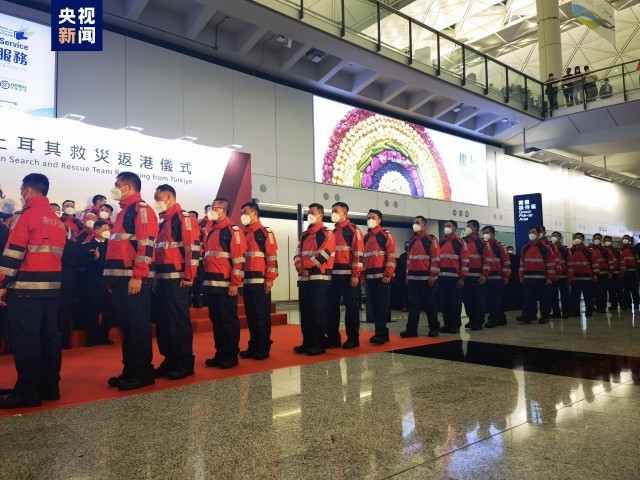 2月18日凌晨,香港特区政府赴土耳其灾区救援队完成土耳其地震灾区搜救任务返港,特区政府在香港国际机场为队员举行迎接仪式。香港特别行政区行政长官李家超、政务司司长陈国基、保安局局长邓炳强和消防处处长杨恩健出席。