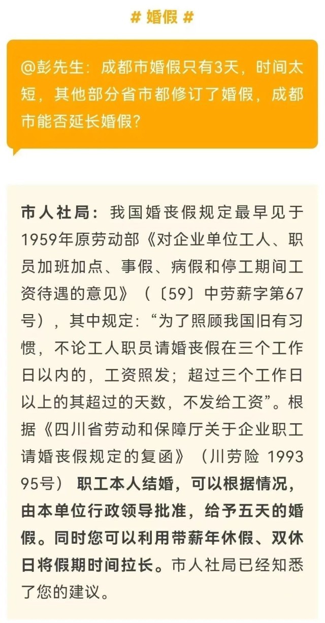 据 成都发布消息,近日,有四川成都市民留言称,“成都市婚假只有3天,时间太短,其他部分省市都修订了婚假,成都市能否延长婚假?”