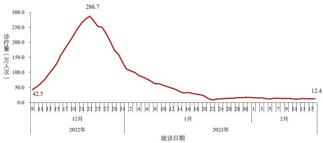 (一)总体就诊人数结果。全国(不含港澳台)发热门诊(诊室)就诊人数于2022年12月23日达到峰值286.7万人次,随后连续下降;2023年1月23日后就诊人数呈现低位波动,2月16日为12.4万人次,较峰值下降了95.7%(图2-1)。