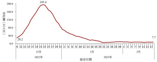 (三)城市发热门诊就诊人数结果。全国二级以上医疗机构和城市社区卫生服务中心发热门诊(诊室)就诊人数于2022年12月22日达到峰值195.4万人次,随后连续下降;1月23日后呈低位波动,2月16日为7.7万人次,较峰值下降了96.0%(图2-3)。