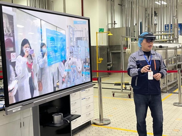走进量产研究中心,记者在一名研究人员的指点下戴上AR眼镜,手指在空中轻盈点击后,眼前立刻出现密布的管线和数据,分别对应搅拌锅中的温度、转速、流量等工业传感器参数。