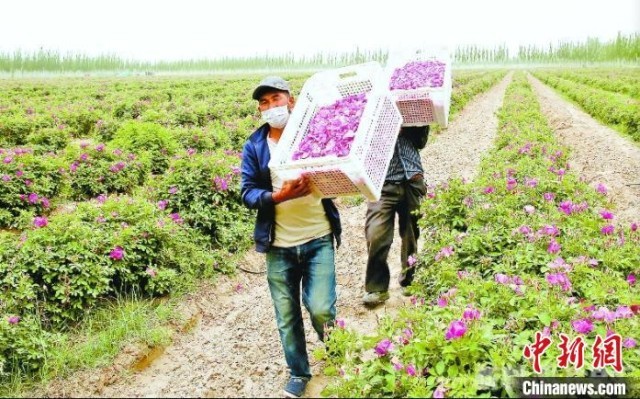 新疆玫瑰花种植重点布局在塔里木盆地南缘的和田地区于田县、和田市、和田县、墨玉县、洛浦县。目前,和田地区玫瑰种植面积近6.5万亩,带动当地1.2万户农民稳定增收。