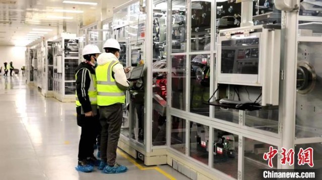 在山东枣庄,欣旺达30GWh动力电池项目卷绕车间员工正在加紧进行设备调试。 刘雅丽 摄