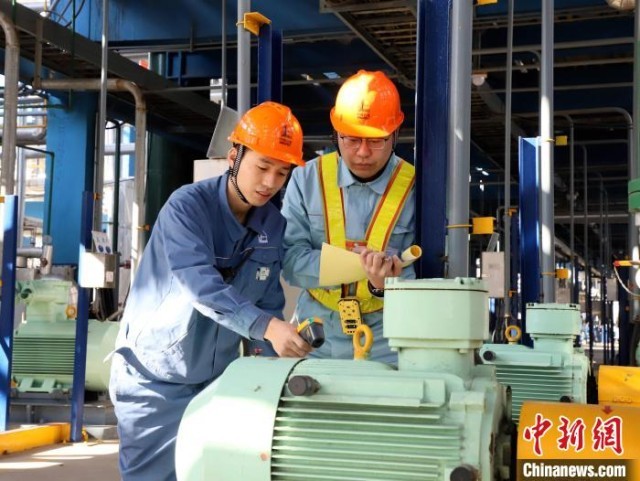 图为齐鲁石化员工巡检监测运转电机温度,确保设备安稳运行。刘芳芳 摄