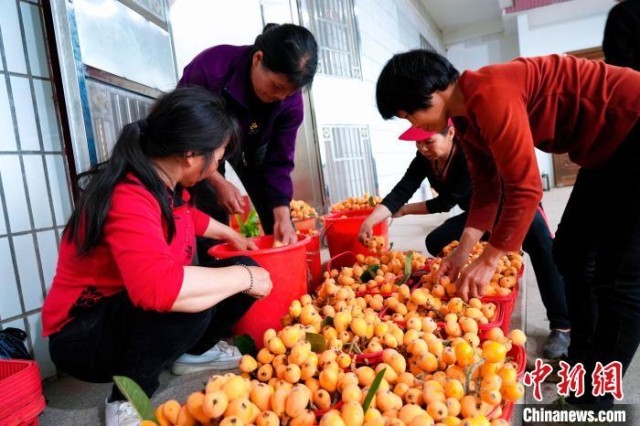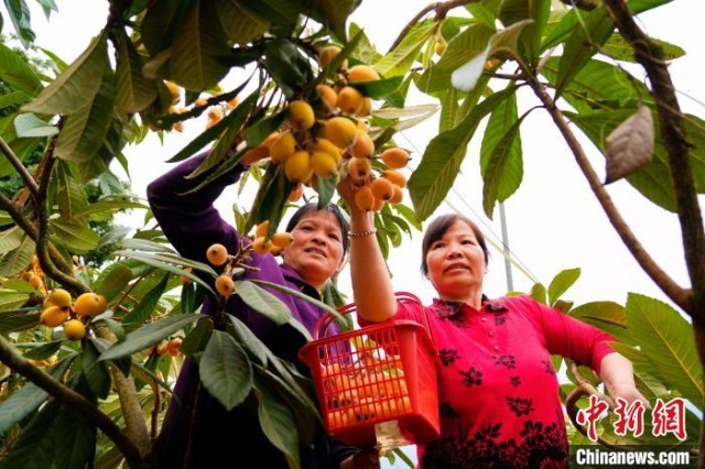 中新网福建永定3月24日电 (黄秋萍)这段时间,福建省龙岩市永定区3000亩枇杷陆续成熟上市。一串串金灿灿的枇杷挂满枝头,格外诱人,种植户们正忙着采摘,让新鲜的枇杷尽早上市,满足市民的口福。
