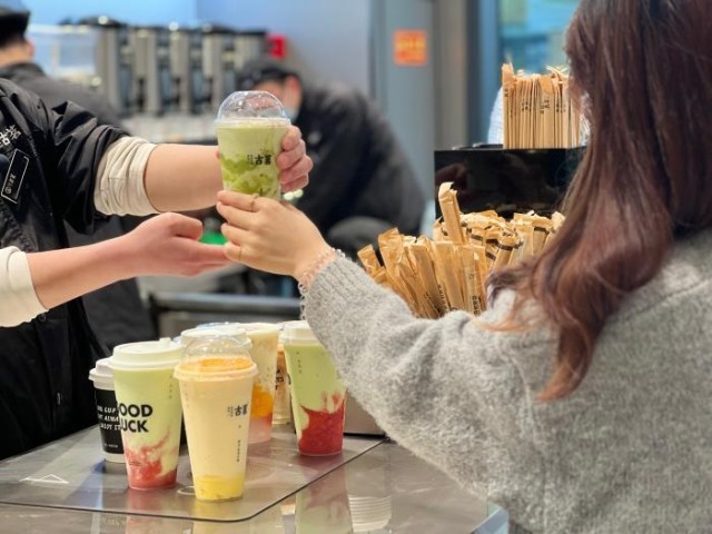 图说:顾客正在门店购买新品鲜果奶昔系列 (图片来源:古茗茶饮)