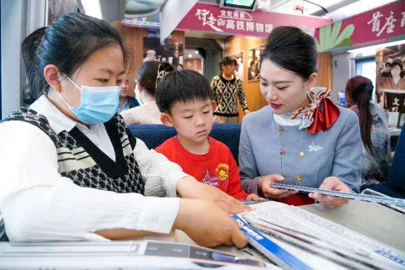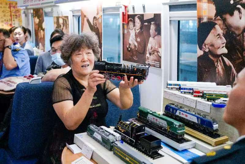 身着不同时期铁路制服的乘务人员,向旅客讲解1435枚硬板车票、206枚火车邮票,0号火车机车、龙号机车、毛泽东号机车等6台机车模型,31件不同时期铁路工作人员制服上的胸章、臂章、肩章,88枚铁路老式徽章、帽徽、路徽、纪念章等“老物件”的历史故事。