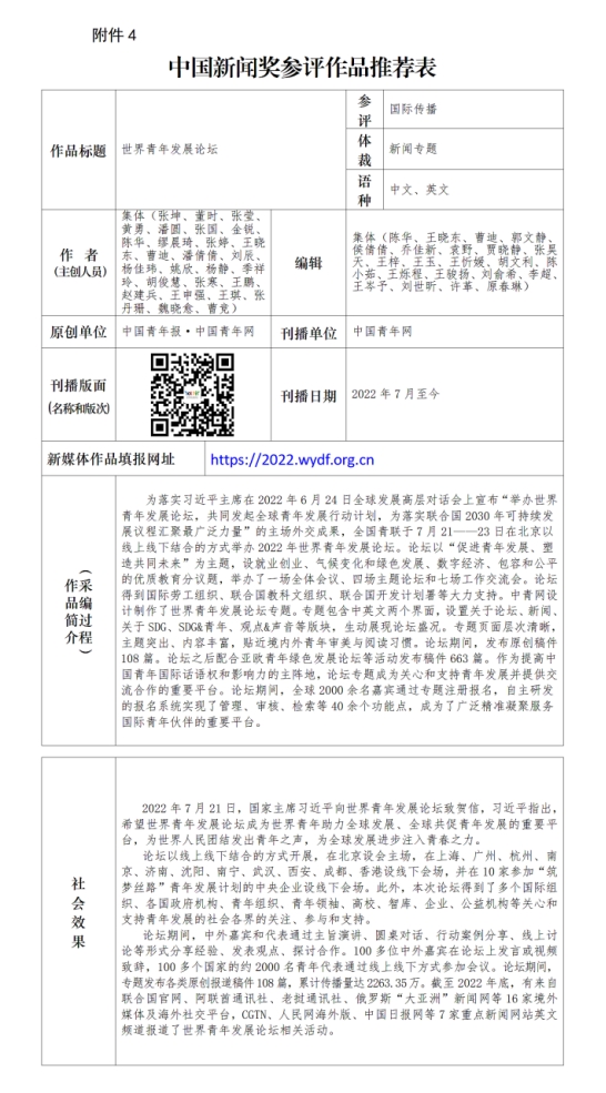 根据《中国新闻奖评选办法》的要求,现对中国青年报社推荐参评第33届中国新闻奖《世界青年发展论坛》予以补充公示。