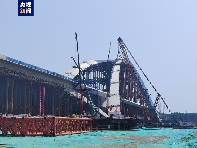 据介绍,京雄大桥主桥桥梁采用飞燕式拱桥结构,桥梁拱肋和主梁均采用钢结构设计,钢材用量达2.2万吨。为了方便加工制造和吊装,全桥钢结构共划分成126个形态各异的钢“积木”,最重的单个240吨。