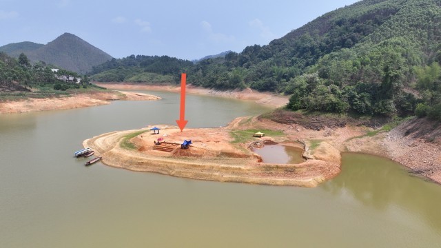 发现战国古墓的达洪江水库库区半岛(箭头处为铜鼓发掘位置)。覃蔚峰摄