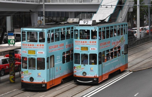 涂有2023年区议会一般选举宣传广告的电车。新华社记者 陈铎 摄