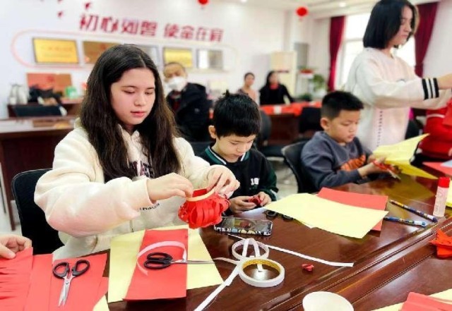 伴随着欢快音乐,居民们沉浸式感受中国传统年俗活动。在社区工作人员组织下,大家写下承载着龙年新春祝福的春联和遒劲有力的“福”字,为新春佳节增添吉祥喜庆的气息。手工灯笼制作环节,大人小孩齐参与,现场其乐融融,感受新春年味儿。剪窗花,是春节的传统习俗。付子涵小朋友兴奋地举着自己的剪纸说:“我的图案是五谷丰登,希望新的一年里,每个人都能收获满满!”这些剪纸作品表达了孩子们对新年的美好祝愿。