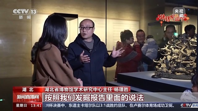 湖北省博物馆学术研究中心主任 杨理胜:这个文物,我们给它取了一个名字,叫作“史上最纠结的文物”。其实它是固定上面的一个鼓的,按照我们发掘报告里面的说法,它是八条主龙,头部、身子、尾巴上面再焊接了一些小龙。