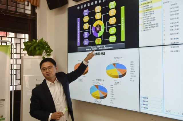 “渔博士”沈杰在浙江省湖州市菱湖镇创办的公司内介绍汇集养殖户、饲料厂商、销售档口、金融机构等相关方的物联网平台(资料照片)。