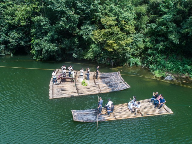 在杭州余杭区中泰街道,演奏者在竹排上演奏竹笛(资料照片)。