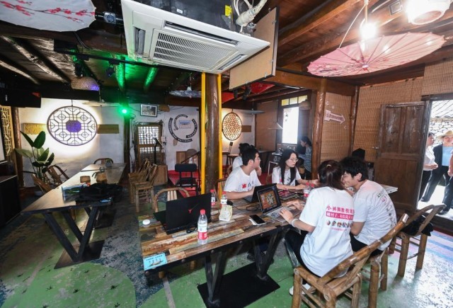 2023年8月11日,高校艺术院系的大学生们在宁波市宁海县葛家村的特色酒吧内讨论村落艺术改造提升的设计方案。