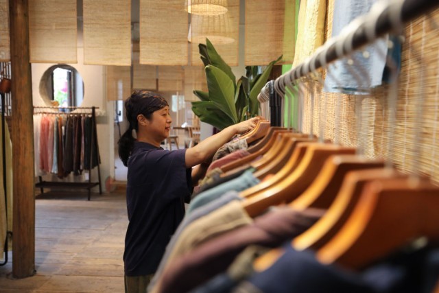 2023年5月23日,在浙江省义乌市李祖村,“农创客”鲍丽萍在店铺里整理服装产品。