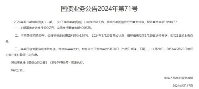 财政部官网17号发文称,本期国债实际发行面值金额400亿元,经招标确定的票面利率为2.57%,2024年5月20日开始计息,招标结束后至5月20日进行分销,5月22日起上市交易。