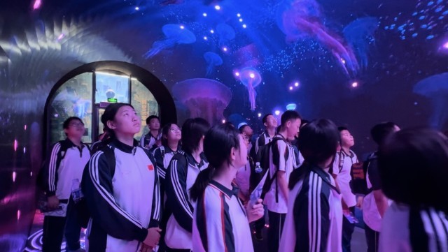 “哇~”伴随着粉色“水母”的出现,现场参观的数十位青少年发出了惊呼。这不是在海底,而是在由中科世园数字演绎联合实验室通过数字孪生技术打造的虚拟海底世界,模拟的环境音以及一比一还原的海洋生物,让观众仿佛真实置身于海底世界。