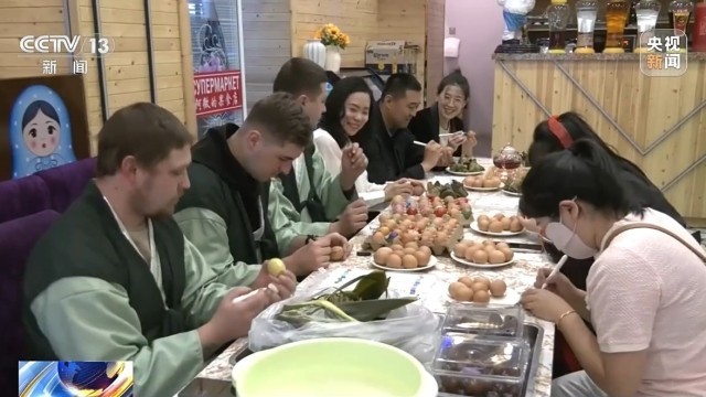 在黑龙江绥芬河市,俄罗斯游客穿上了中华传统民族服饰,与当地居民一起包粽子、画彩蛋,玩得不亦乐乎。
