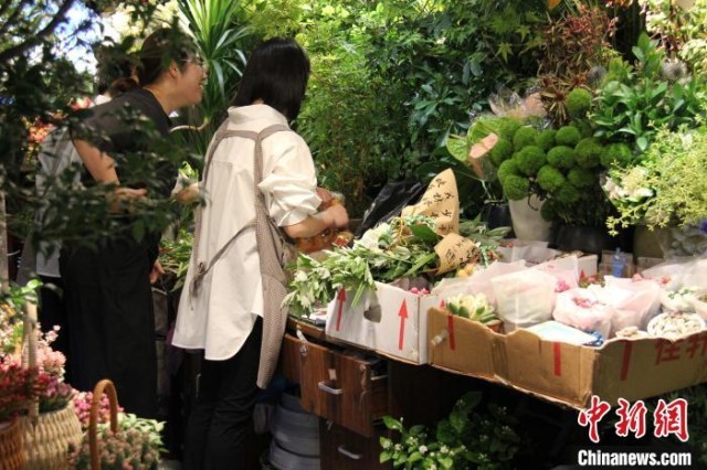吴山花鸟城是杭州“老网红”地标。今年端午期间,市场里近10家专售花草的店铺做起了新中式艾草门挂。简单的艾草束搭配菖蒲、刺秦、黄金果等叶材以及香囊、挂牌等配饰,既美观又有“仪式感”。这样的一束艾草门挂在花鸟城的市场价在35元至50元之间。